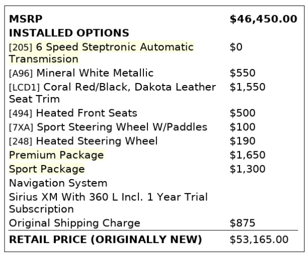 installed options sport package $1,300.00